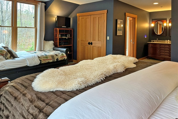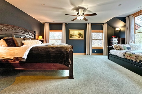 The first floor is its own house, with a living room and full kitchen, giving large groups space to spread out and have privacy.